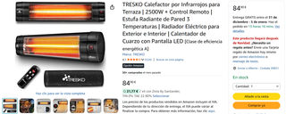 VENDO 2 Calefactores TRESKO para terraza, con 2500W de potencia y pantalla LED. Incluye mando a distancia para un control cómodo. Están completamente nuevos, sin usar. Precintadas en su embalaje original. Comprados este mes de diciembre (puedo enseñar factura para la garantía). Compré los radiadores para un proyecto de cerramiento de una terraza grande que íbamos a hacer en familia para Navidad. Por cambio de planes de última hora, la obra se ha cancelado y ahora me sobran. En Amazon cuestan 85€ la unidad. Si compras ambos, dejo el pack a 110€. (60€ de ahorro).