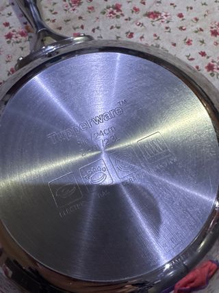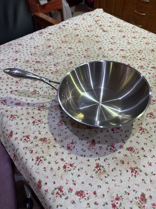 Sartén de metal con un diseño elegante y funcional. - Acabado plateado brillante. - Mango ergonómico para un agarre cómodo.