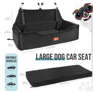 Asiento para coche de perro modelo HEGGCOOE, diseñado para perros de hasta 45 kg. - Capacidad para un perro grande de hasta 100 lb (45 kg) o dos perros medianos de hasta 35 lb (16 kg) cada uno. - Cubierto con tejido de felpa suave y relleno de esponja de alta densidad para mayor comodidad. - Fondo antideslizante y correas ajustables para una instalación segura. - Incluye agujeros para pasar el cinturón de seguridad del coche y correas internas para sujetar al arnés del perro.