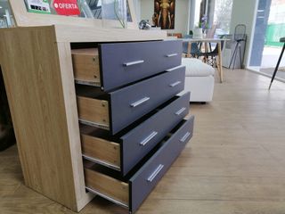 Cómoda de diseño moderno con acabado en grafito y detalles en madera. - Medidas: 98 cm de ancho, 85 cm de alto y 40 cm de profundidad. - Cajones amplios y fáciles de abrir. - Estructura robusta.