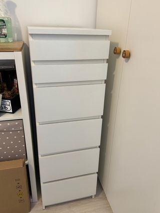 Cómoda de seis cajones de la serie MALM de Ikea. Su diseño es moderno y funcional, ideal para organizar tu ropa y accesorios. - Acabado en madera blanca. - Seis cajones amplios.