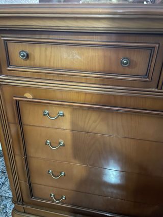 Cómoda de madera con un acabado elegante y tiradores dorados. - Diseño de seis cajones. - Acabado en madera de cerezo. - Tiradores dorados. va junto con el colchón !el colchón está nuevo lo compré para mi hija pero no duerme ahí!! también se vende por separado lo que guste!!