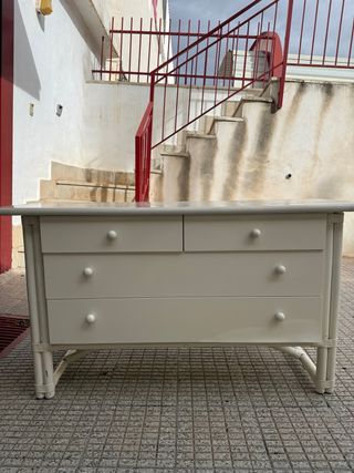 Conjunto de muebles de madera con tapa de mármol.Medida de la cómoda 1,40 de largo de 74 de altura y 44 de profundidad y las mesillas 54 de ancha por 67 de altura y 34 de profundidad más cómodas y cosas en mi perfil dispongo de furgoneta - Cómoda central con múltiples cajones. - Dos mesitas de noche a juego con cajones.