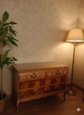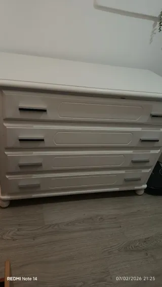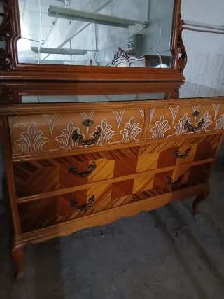 Vendo cómoda de madera con espejo a juego, de segunda mano pero en muy buen estado, sin golpes ni desperfectos importantes. Perfecta para dormitorio o recibidor. Mueble sólido, clásico y funcional, con varios cajones para almacenaje. Medidas aproximadas de la cómoda: • Ancho: 90–100 cm • Fondo: 45 cm aprox. • Alto: 75–80 cm Medidas aproximadas del espejo: • Ancho: 80–90 cm • Alto: 70–80 cm • Forma arqueada, marco de madera 📌 Medidas aproximadas. Se puede vender todo junto o por separado. Recogida en piso.