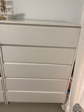 Cómoda de cinco cajones de Ikea en acabado de madera oscura. Un mueble práctico y elegante para organizar tu espacio. - Diseño de cinco cajones amplios. - Acabado en madera de tono oscuro. - 70x40x112 cm