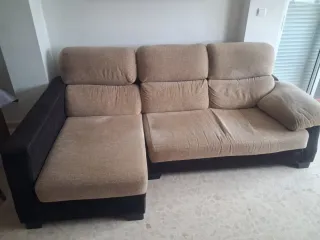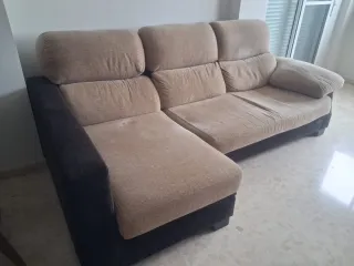 Cómodo sofá modular de tres plazas, perfecto para tu salón. Su diseño combina tonos beige y marrón para adaptarse a cualquier decoración. - Tapicería de tela. - Estructura robusta. Largo: 2,45 mts aprox. Ancho/Fondo: chaiseLongue: 1,30 mts. Aprox Asiento: 1 mt. aprox. Altura del suelo al asiento: 43 cm. aprox. Reposacabezas regulables 3 posiciones. Sofá manual. Asientos extraibles. La zona del asiento biplaza está un poco hundida por el uso.