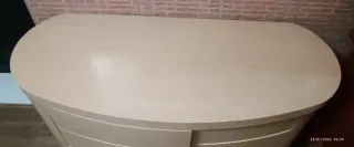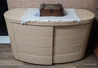 Cómoda de diseño ovalado con cuatro amplios cajones. - En muy buen estado, solo tiene algún que otro arañazo superficial en la parte superior y un lateral. - Cajones grandes y amplios. Se deslizan suavemente. - Creo que el primer y segundo cajón no están colocados donde debieran, es por ello que visto frontalmente se ve algo de separación. Los coloqué mal al quitarlos. Nada importante. - Madera de calidad por lo que pesa bastante (se necesita mínimo dos personas para transportarla). Ayudo - Fabricada en Italia. Medidas en fotos Cajones cm: ancho 98,5 / alto 10 profundidad 50/46 Recogida Estepona Más cosas en mi perfil