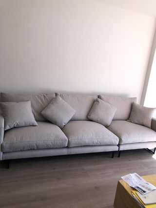 Sofá modular de tela en color beige. Sus cojines son amplios y cómodos, ideales para relajarse. Sofas perfectos y sin defectos solo estan sucios por estar guardados URGE VENTA POR MUDANZA 80€ LOS DOSS URGEEEE - Diseño moderno y versátil. - Tapicería suave al tacto.