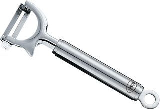 Pelador giratorio marca Rösle transversal de acero inoxidable, ideal para frutas y verduras. - Pelador universal con un grosor de pelado medio; ideal para verduras largas y delgadas como zanahorias, calabacines o pepinos. - Diseño giratorio para mayor comodidad. - Adecuado tanto para zurdos como diestros. - Fabricado en acero inoxidable 18/10 de calidad. - Mango ergonómico para un agarre seguro. - Hoja afilada para un pelado eficiente. - Con argolla de suspensión - Duradero y sostenible gracias a la cuchilla intercambiable