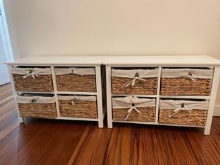 Una mesita / cómoda blanca con cestas de mimbre. - Diseño moderno y funcional. - Cada mesita incluye dos cestas de mimbre con forro de tela. - Tengo dos, el precio es por cada una.