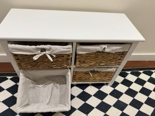 Mueble auxiliar de estilo moderno con acabado en blanco. Incluye cestas de mimbre con forro de tela. - Estructura de madera. - Cestas de mimbre con forro de tela. - Acabado en blanco. - Tengo 2 a la venta, el precio es por la unidad
