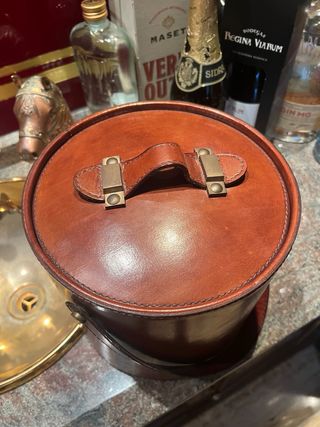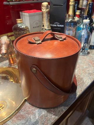 Elegante cubertera de cuero con un asa para facilitar su transporte. - Diseño cilíndrico. - Cierre con broches metálicos. Cubertera con exterior de cuero auténtico marrón y cubeta interior de acero inoxidable, ideal para barra de bar o comedor. Lleva tapa a juego con asa superior y asa lateral para transportarla cómodamente. Marca Q&Q en la base con referencia visible en la pegatina; estado muy bueno, solo pequeñas señales de uso normales. Pieza muy decorativa, perfecta para dar un toque clásico y elegante a tu zona de copas.