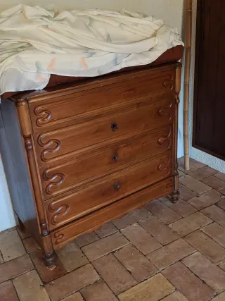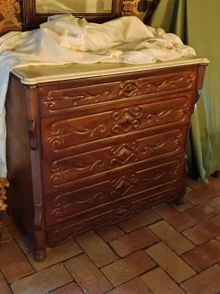 Elegante cómoda de madera de caoba con sobre de mármol y espejo a juego. También disponible la cama. El precio és por la cómoda, el espejo són 150 eur - Diseño clásico con detalles tallados. - Incluye espejo a juego. - Cajones amplios para almacenamiento.