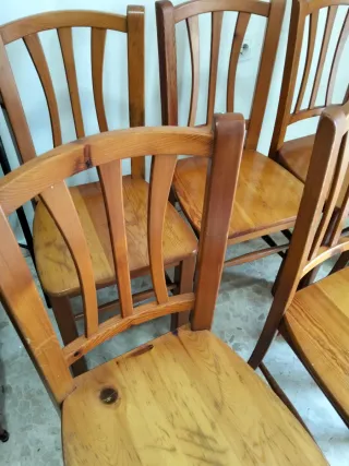 Conjunto de seis sillas de madera estilo provenzal con un acabado en tono marrón. Perfectas para comedor o cocina. - Diseño clásico y elegante. - Asientos cómodos y resistentes. El precio es por todas