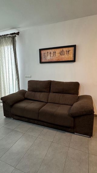 Cómodo sofá de dos y tres plazas en un tono marrón oscuro. Su diseño moderno se adapta a cualquier sala de estar. NUEVO - Tapicería de tela. - Estructura robusta. (400€ el conjunto)