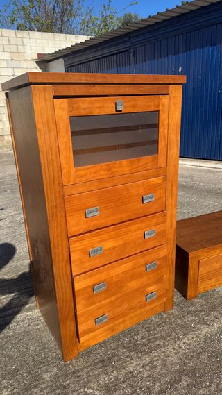 Conjunto de muebles de dormitorio de madera. - Cómoda alta con 5 cajones y un compartimento superior con cristal. - 2X Mesita de noche con un cajón.