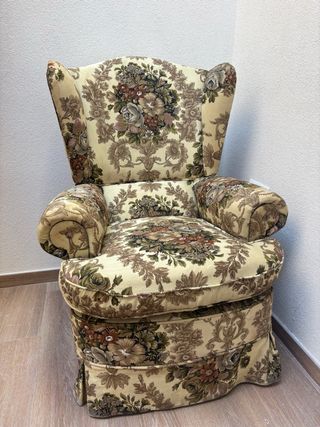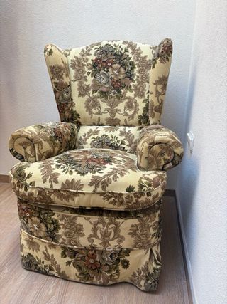 Butaca individual de estilo vintage con un bonito estampado floral. - Diseño clásico y elegante. - Tapicería de tela con motivos florales en tonos beige y multicolor. - Estructura robusta y cómoda. -estilo wingback Años 70