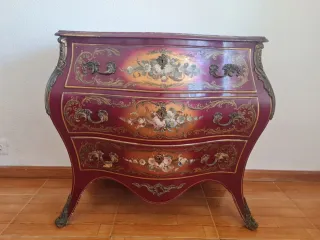 Se vende preciosa cómoda o chiffonier de tres cajones. Esta pieza destaca por su marcada forma curva (estilo bombé) y su rico acabado en color granate/borgoña intenso. Presenta un exquisito trabajo de pintura a mano con motivos florales (rosas y ramilletes) y volutas doradas que realzan su carácter vintage y sofisticado. Cuenta con tres amplios cajones con frente curvo y tiradores de metal con motivos ornamentales que complementan el diseño. Las patas son cabriolé y terminan en remates de metal. Una pieza ideal para dar un toque de elegancia, estilo Rococó o clásico veneciano a cualquier dormitorio, salón o recibidor.