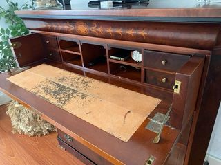 Joya Clásica para Restaurar! Impresionante cómoda de madera de caoba maciza con marquetería fina, tiradores de bronce grabado y molduras elegantes. Estilo victoriano o neoclásico, perfecta para dormitorio principal o salón como pieza focal. 5 cajones amplios y uno superior con muchos compartimentos y con posibilidad de abrirlo y dejarlo abierto como se ve en la foto Medidas: 115 cm ancho x 48 cm fondo x 106 cm alto Estado: Estructura fuerte y cajones funcionales, pero con signos de antigüedad: arañazos y marcas varias..detalles que requieren pulido o retoque. ¡Oportunidad única para coleccionistas o amantes del vintage!