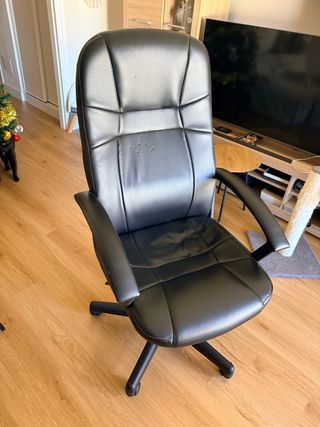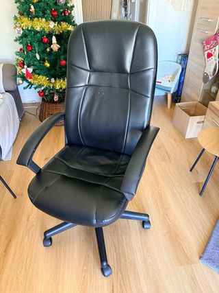 Sillón de oficina con un diseño moderno y cómodo. - Tapicería de piel. - Base giratoria con ruedas. - Tiene unas marcas en el respaldo de mi gato que lo rasco un poco,yo siempre le ponía una funda y es muy cómoda