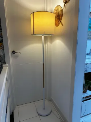 Lámpara de pie moderna y elegante de Conforama, en excelente estado como nueva. Diseño minimalista con poste blanco metálico y un toque natural de bambú en la sección central, que le da un estilo boho-chic perfecto para decorar salones, dormitorios o rincones acogedores. La pantalla cilíndrica de tela beige proporciona una luz suave y cálida, ideal para leer o crear ambiente. Altura aproximada de 150-160 cm, base redonda blanca estable y cable con interruptor de pie para mayor comodidad. Funciona perfectamente. ¡Un chollo para renovar tu hogar!