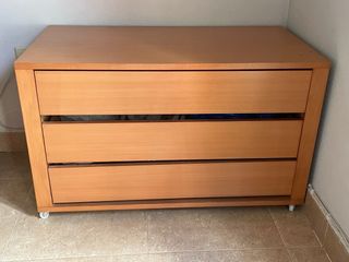 Mueble de madera con tres cajones amplios. - Diseño sencillo y funcional. - Ideal para organizar ropa o accesorios. - Ruedas para fácil movilidad.