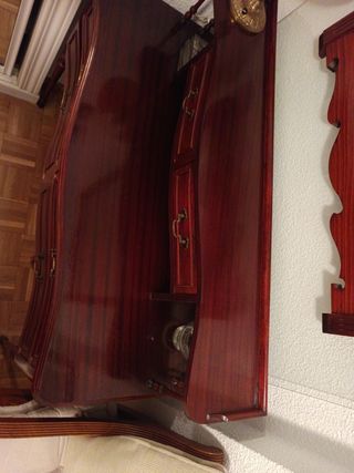 Elegante conjunto de dormitorio de estilo antiguo, fabricado en madera de caoba. - Cómoda de seis cajones con espejo. - Dos mesitas de noche. - Cabecero de cama con detalles ornamentales.
