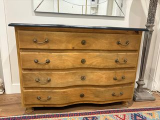 Cómoda de estilo francés con un diseño elegante que combina madera maciza de acacia y detalles en negro. Sus líneas curvas le dan un toque distintivo. - Tiradores metálicos. - Cuatro cajones amplios. - Acabado en madera natural.