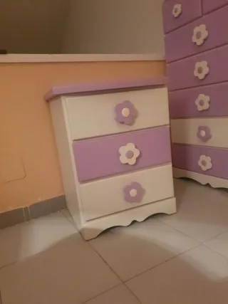 Conjunto de muebles infantiles compuesto por una cómoda y una mesita de noche. - Diseño con detalles de flores. - Cajones en color blanco y lila. Medidas mesilla 47x43x62 y cómoda 62x49x110 Opción de venta por separado, mesilla 20 eur y comoda 40 eur