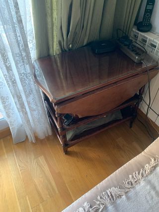 Mueble auxiliar de madera con superficie de cristal. - Diseño elegante y funcional. - Estructura de madera robusta. - Encimera de cristal. - Dos estantes inferiores para almacenamiento.