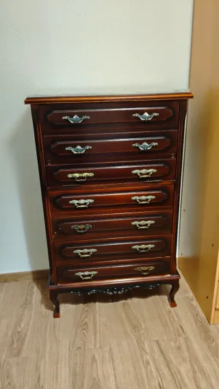 Cómoda de madera de alta calidad con un diseño clásico y elegante. - Amplio espacio de almacenamiento. - Tiradores metálicos decorativos. - Acabado en tono madera natural. Tengo dos iguales. Precio negociable y aún más si se compran las dos.