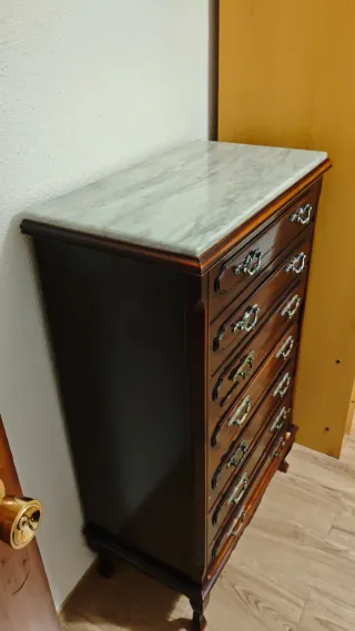 Elegante cómoda antigua con un diseño clásico y sofisticado. Su tapa de mármol le da un toque de distinción. - Mueble de madera de alta calidad. - Tapa superior de mármol veteado. - Cajones con tiradores ornamentados.