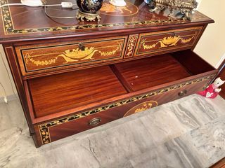 Cómoda de madera con detalles de marquetería, ideal para restaurar y darle un nuevo aire. - Diseño clásico con múltiples cajones. - Marquetería decorativa en los frentes. Falta parte de dos tiradores