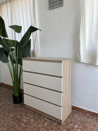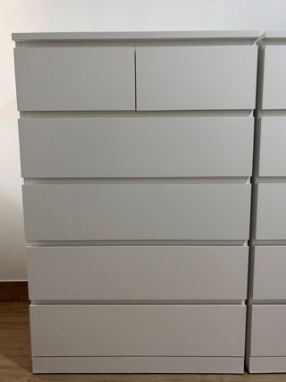 Importante: - ÚNICAMENTE PARA RECOGIDA EN MÁLAGA CAPITAL - NO SE VENDEN POR SEPARADO Juego de 2 Cómodas MALM blancas de 4 cajones de Ikea. Una de ellas tiene pequeños desperfectos por humedad en el tablero superior y en el fondo (VER FOTOS), pero no afectan dentro de los cajones ni se aprecian con el mueble instalado. Se venden por renovación de dormitorio. Únicamente para recogida en Málaga; no tengo cómo transportarlas. Se venden ambas juntas y el precio incluye las dos.