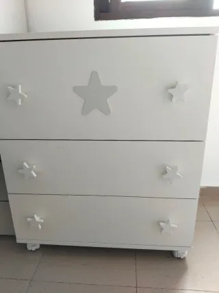Cómoda de tres cajones con un diseño encantador de estrellas. - Acabado en color blanco. - Detalles decorativos de estrellas en relieve. - Tiradores en forma de estrella. Tiene apertura por arriba porque traía una bañera y la parte de arriba puse un cambiador. Después sólo la usé como cajonera. MEDIDAS EN FOTOS. SOLO VENTA EN PERSONA.