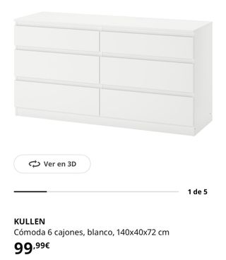 Cómoda KULLEN de seis cajones. Sus dimensiones son 140 cm de ancho, 40 cm de fondo y 72 cm de alto. - Cajones con medidas de 64 cm de ancho, 34 cm de fondo y 10 cm o 12 cm de alto. Tiene algo pequeño rayón que enseño en la foto. Uno de los cajones esta algo hundido