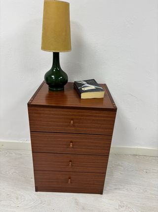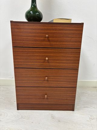 Cómoda de cuatro cajones en contrachapado madera marrón diseñada para interior de armario. - Tiradores integrados en cada cajón. - Cuidada y bien conservada. - Los cajones deslizan perfectamente