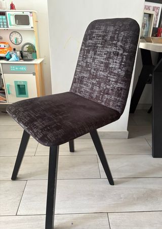 Conjunto de seis sillas de comedor con un diseño moderno y elegante. Son cómodas y aportan un toque distintivo a cualquier espacio. - Tapicería en tela. - Patas de madera.