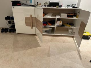 Mueble tipo cómoda con un diseño moderno y elegante. - Combinación de acabados en blanco brillante y detalles en madera. - Tiradores integrados en los frentes.