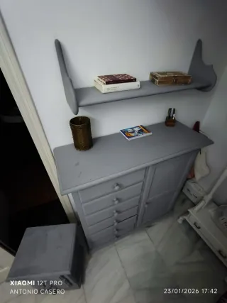 Mesa cómoda de madera con un diseño clásico y funcional. - Cinco cajones para almacenamiento. - Tiradores redondos de madera. Le falta un pomo a un tirador. Si se compra esta cómoda junto con las mesas de noche, lo rebajo a 50€ todo.