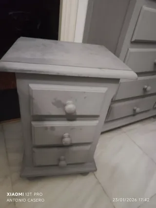 Conjunto de muebles de dormitorio compuesto por una cómoda y dos mesitas de noche. - Diseño clásico y elegante. - Acabado en madera oscura. - Tiradores metálicos. - Medidas de las mesitas: Ancho 56cm, Fondo 42cm, Alto 69cm. - Medidas de la cómoda: Ancho 120cm, Fondo 42cm, Alto 76cm. - Las mesitas tienen 5 cajones. - La cómoda tiene 8 cajones. Están en perfecto estado, solo tienen unos pequeños rayones facilmente reparables con un barniz a color.