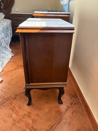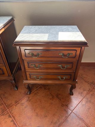 Conjunto de dos mesitas de noche y una cómoda con acabados de madera y detalles de mármol. - Diseño elegante y clásico. - Tres cajones en la cómoda. - Patas curvas distintivas.
