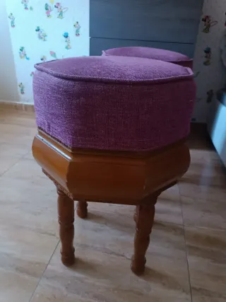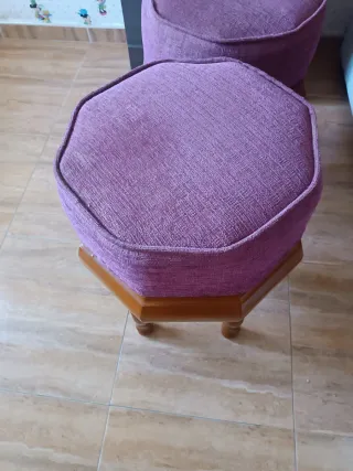 Conjunto de 3 taburetes con un diseño elegante y cómodo. - Tapicería de tela en color morado. - Base y patas de madera con acabado en tono marrón. El precio es de los 3