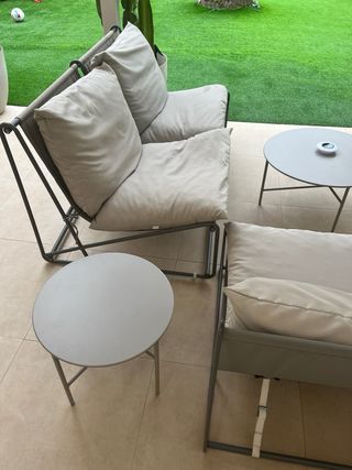 Conjunto de muebles de exterior con un diseño moderno y elegante. Ideal para disfrutar de tu terraza o jardín. - Estructura metálica resistente. - Cojines de tela cómodos y duraderos. - Incluye un sofá y un sillón individual. - Mesas auxiliares redondas a juego.