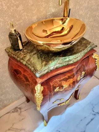 Elegante mueble con gran carga histórica. Se trata de una cómoda antiquísima de estilo Luis XV, convertida en mueble de lavabo con un diseño clásico y lujoso. ● Encimera de un precioso mármol verde veteado. ● Cuerpo abombado madera con incrustaciones y dibujo. ● Detalles ornamentales dorados en pan de oro. ● Patas curvas características del estilo. ● Lavabo en forma se poza dorado; absolutamente nuevo. ● Grifo alto dorado.