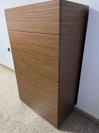 Cómoda de madera maciza, ideal para dormitorio o recibidor, con diseño clásico y elegante. Tiene marcas de desgaste y uso que se ven en las fotos. Los cajones están perfectamente y la estructura también. No hago envíos. Hazme una oferta. - 5 cajones amplios y espaciosos. - Tiradores de metal. - Acabado en color marrón oscuro.