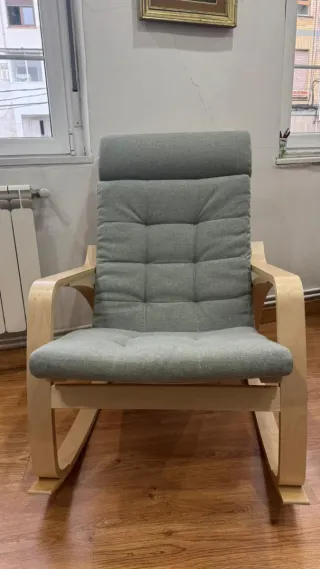 Sillón mecedora de madera de abedul, sin usar. - Estructura de madera curvada. - Cojines mullidos en tela verde agua. - Reposacabezas integrado para mayor comodidad.