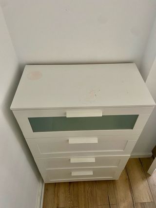 Cómoda blanca de Ikea, serie Brimnes, con algunos desperfectos por el uso, sobre todo tapa superior (segunda foto). Cajones en perfecto estado de apertura y cierre. Precio nueva: 119 €. Sólo recogida.