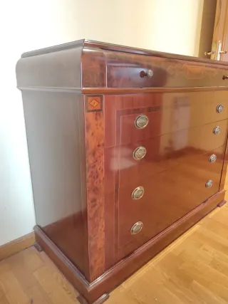 Conjunto de cómoda y mesitas de noche con un diseño clásico y elegante. Madera y marquetería, cajones emmechados. Alta calidad. Se vende por mudanza. Urge!!! Todo por 90€ - Acabado en tonos marrones y dorados. - Fabricado en madera de alta calidad. - Detalles de marquetería en los frentes.