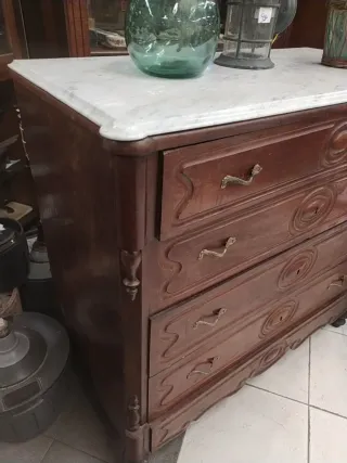 Elegante cómoda de estilo Alfonsina con un diseño clásico. - Encimera de mármol. - Cajones con tiradores ornamentados. - Patas talladas. Galerías 66 Reus Av St Bernat Calbó 35-37 Tienda de segunda mano y ocasión